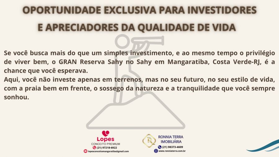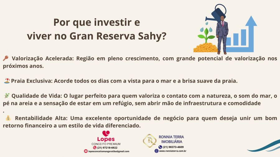 Imagine construir a casa dos seus sonhos em um cenário paradisíaco, cercado pela natureza exuberante da Costa Verde. Apresentamos um terreno exclusivo no prestigiado Gran Reserva Sahy, em Mangaratiba, um refúgio de tranquilidade e sofisticação.
